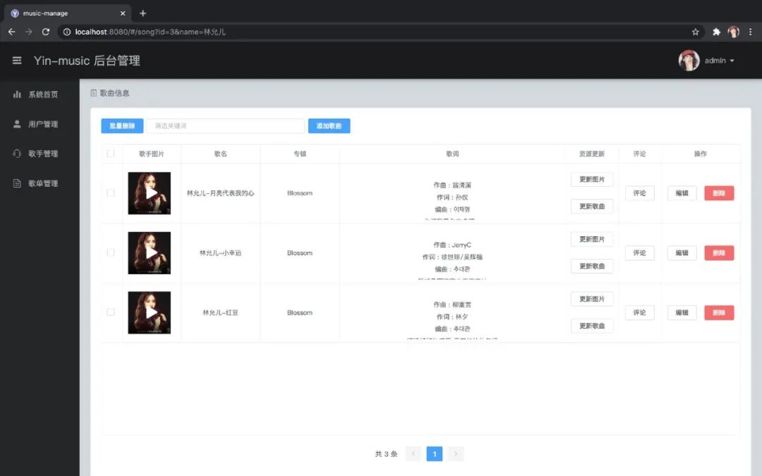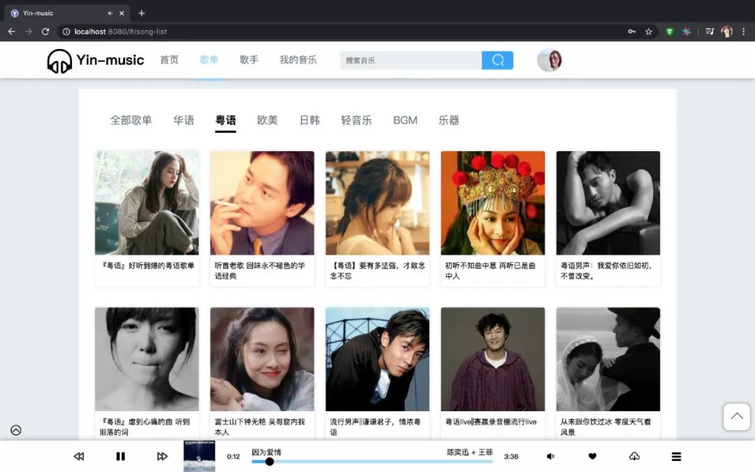 该系统包含音乐网站基本功能:音乐播放、用户管理、歌曲管理、歌单管理、歌手信息、歌词显示、音乐播放相关功能、后台管理。