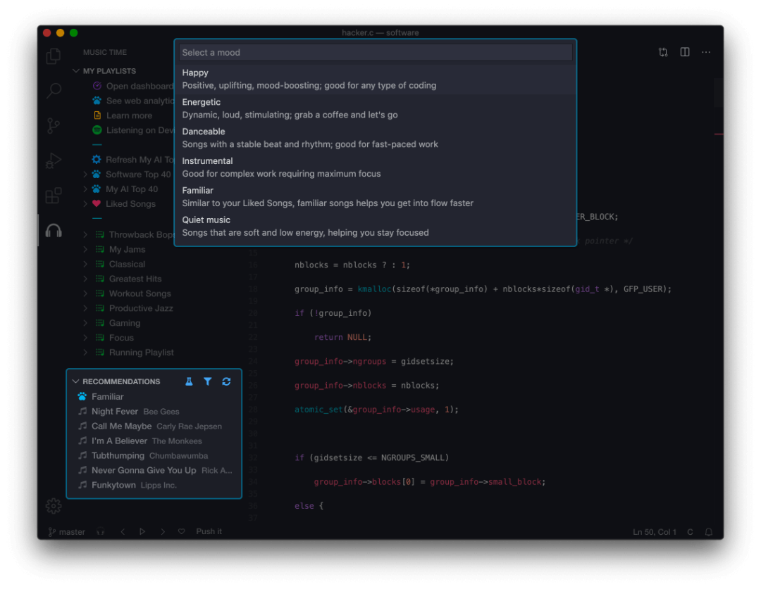 安装了这个插件,除了能获得个性化的歌曲推荐,你还可以直接从编辑器的状态栏控制音乐,在编辑器中浏览和播放 Spotify 播放列表和歌曲。