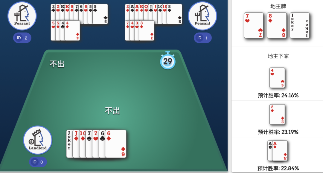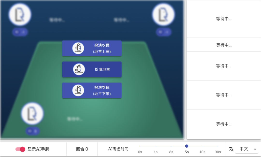 选择当地主来玩玩看,可以打开显示 AI 手牌功能,更容易观察 AI 决策过程。另外可以设置 AI 考虑时间,默认是 3 秒。