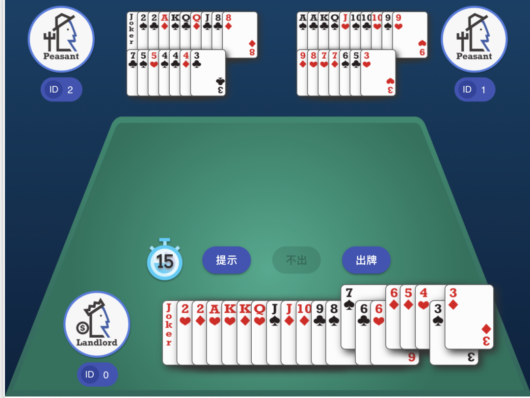 打开上面的试玩链接,就能和 DouZero 对线了。在线试玩中是三人斗地主模式,玩家可以选择扮演地主或者农民。