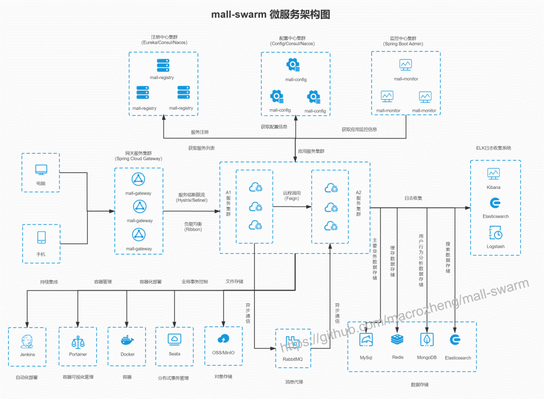该项目采用了 Spring Cloud Hoxton & Alibaba、Spring Boot 2.3、Oauth2、MyBatis、Docker、Elasticsearch 等核心技术,同时提供了基于Vue的管理后台方便快速搭建系统。mall-swarm 在电商业务的基础集成了注册中心、配置中心、监控中心、网关等系统功能。