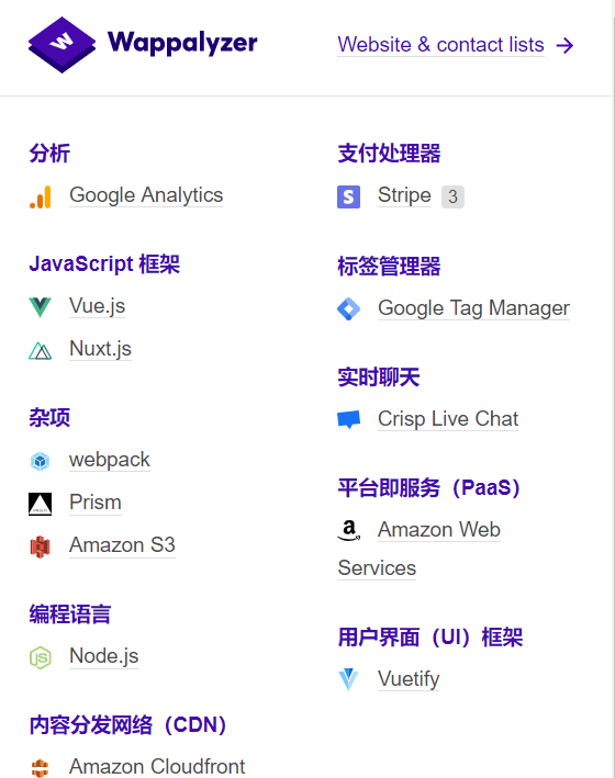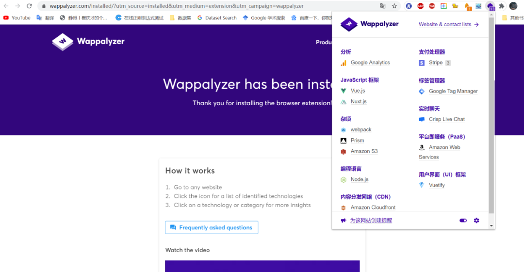 以 wappalyzer 的官网为例:点击插件图标,分析技术栈: