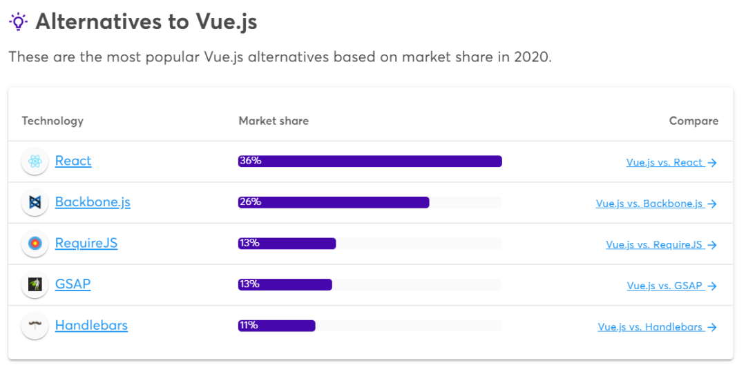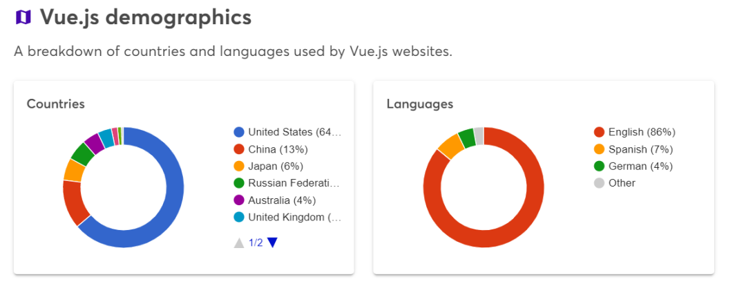 以 Vue 为例,每项技术都会给出翔实的可视化统计:使用 Vue 的头部网站(按访问流量排名)