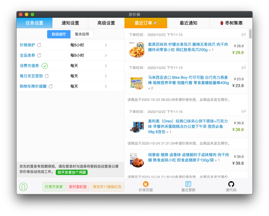 自动监控最近订单商品的价格变化,在商品降价时自动申请价格保护