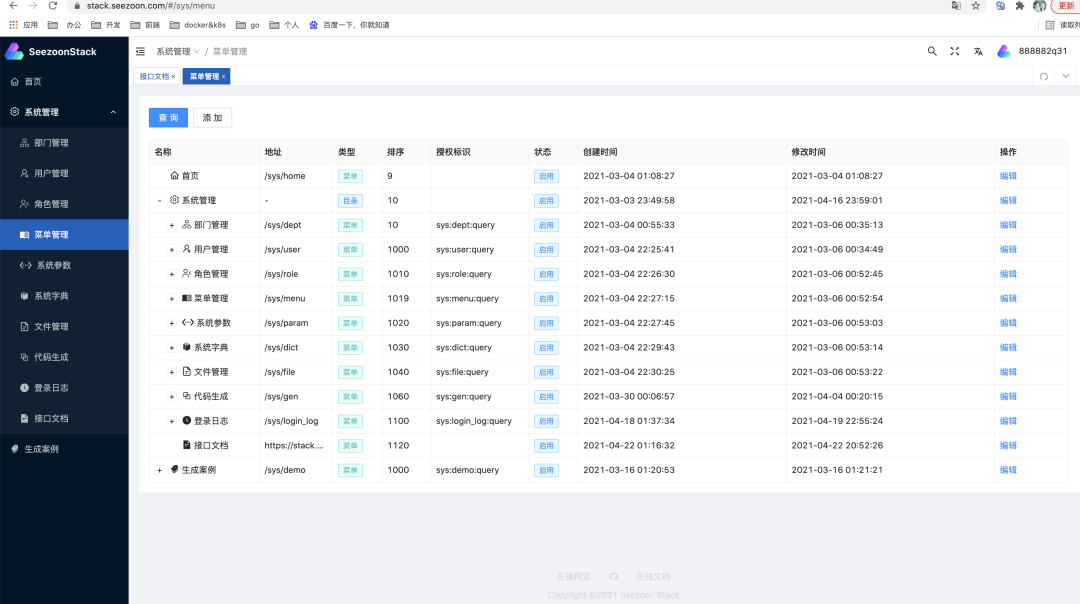 Seezoon Stack 是一款基于当前最前沿的前端和后台实现的低代码开发平台。前端技术栈基于 Vue3 + Vite + Antdv,后端技术栈基于 Spring boot。