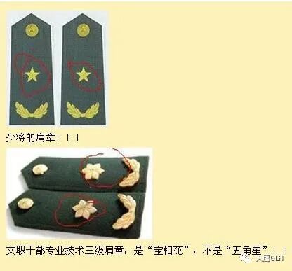 但也有一个小小的区别,就是专业技能在三级以上的文职干部,除了肩章上的“宝花”标志外,还会配有与将军相同的松柏枝,实际上在军衔和待遇上相当于将军。
