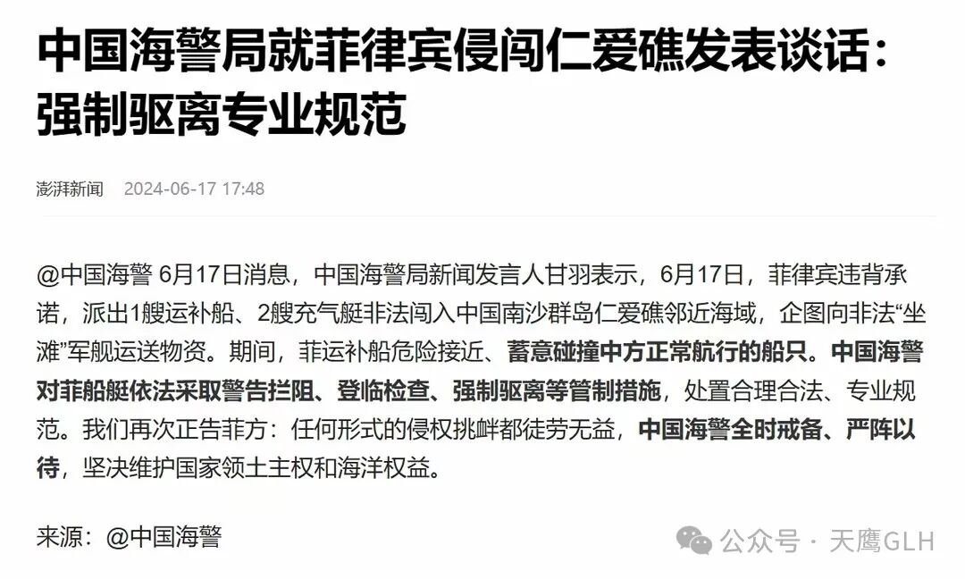 中方的说法也简单:中国海警依法对非法闯入我南沙群岛仁爱礁邻近海域的菲律宾船只采取采取“警告拦阻、登临检查、强制驱离”等管制措施。已经出现了“登临检查”的说法,可以想见双方舰艇之间的对抗激烈程度。以至于在6月17日当天,人们暂时不清楚,中国和菲律宾如何在仁爱礁进行全面对抗。很显然,中国海警执法会有执法视频的,菲律宾方面吃亏也必然会有随船记者拍摄的,但是一直没有公布。
