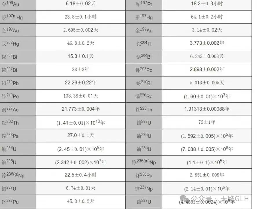 【不同元素半衰期】