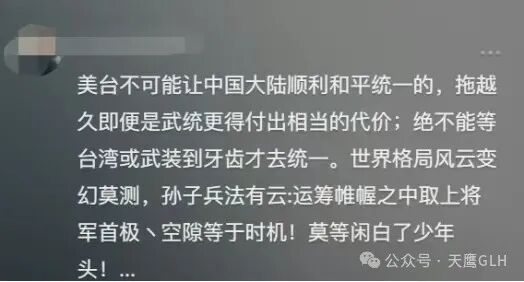 “美台不可能让中国大陆顺利和平统一的,拖越久,即便是武统更得付出相当大的代价;绝不能等台湾武装到牙齿才去统一。世界格局风云变幻莫测,孙子兵法有云:运筹帷幄之中取上将军首极。”