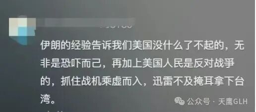 “伊朗的经验告诉我们美国没什么了不起的,无非是恐吓而己,再加上美国人民是反对战爭的,抓住战机乘虚而入,迅雷不及掩耳拿下台湾。”