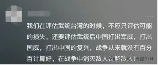 “我们在评估武统台湾的时候,不应只评估可能的损失,还要评估武统后中国打出军威,打出国威,打出中国的复兴,战争从来就没有百分百计算好,在战争中消灭敌人瓦解敌人!”