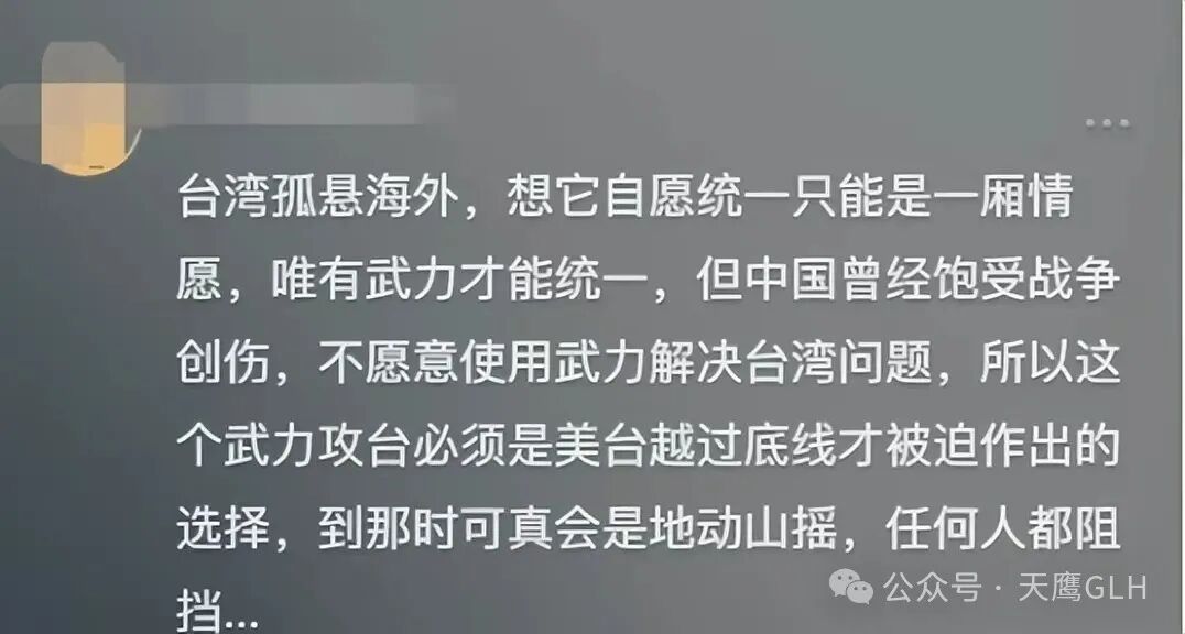 “台湾孤悬海外,想它自愿统一只能是一厢情愿,唯有武力才能统一,但中国曾经饱受战争创伤,不愿意使用武力解决台湾问题,所以这个武力攻台,必须是美台越过底线,大陆才被迫作出的选择,到那时可真会是地动山摇,很可能多方势力都回来阻挡”