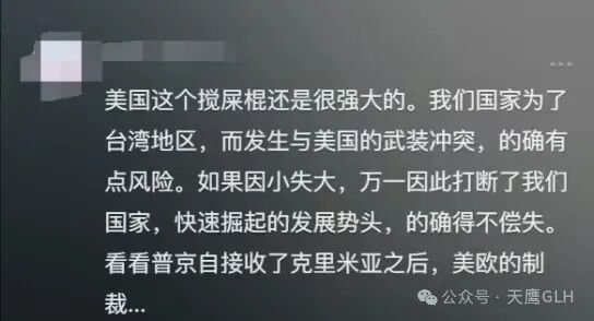 “美国这个搅屎棍还是很强大的。我们国家为了台湾地区,一旦发生与美国的武装冲突,的确有点风险。如果因小失大,万一因此打断了我们国家快速崛起的发展势头,的确得不偿失。看看普京自接收了克里米亚之后,美欧的制裁对俄罗斯的影响有多大,就可以明白为何我国在武统上如此谨慎了”