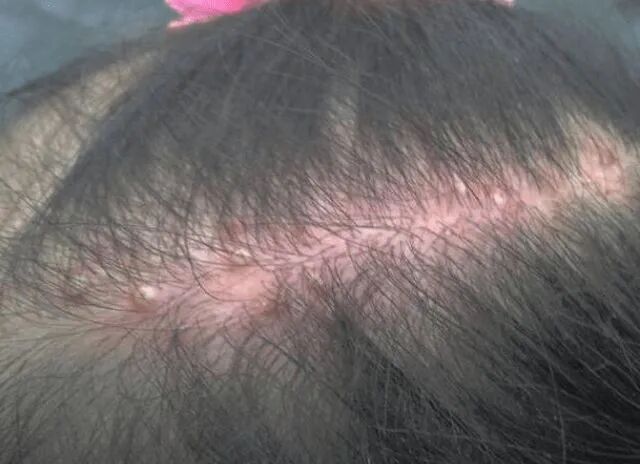 毛囊炎是一种常见的皮肤疾病,通常由细菌感染引起。患者头皮上会出现红色丘疹和脓包,伴有疼痛和瘙痒。