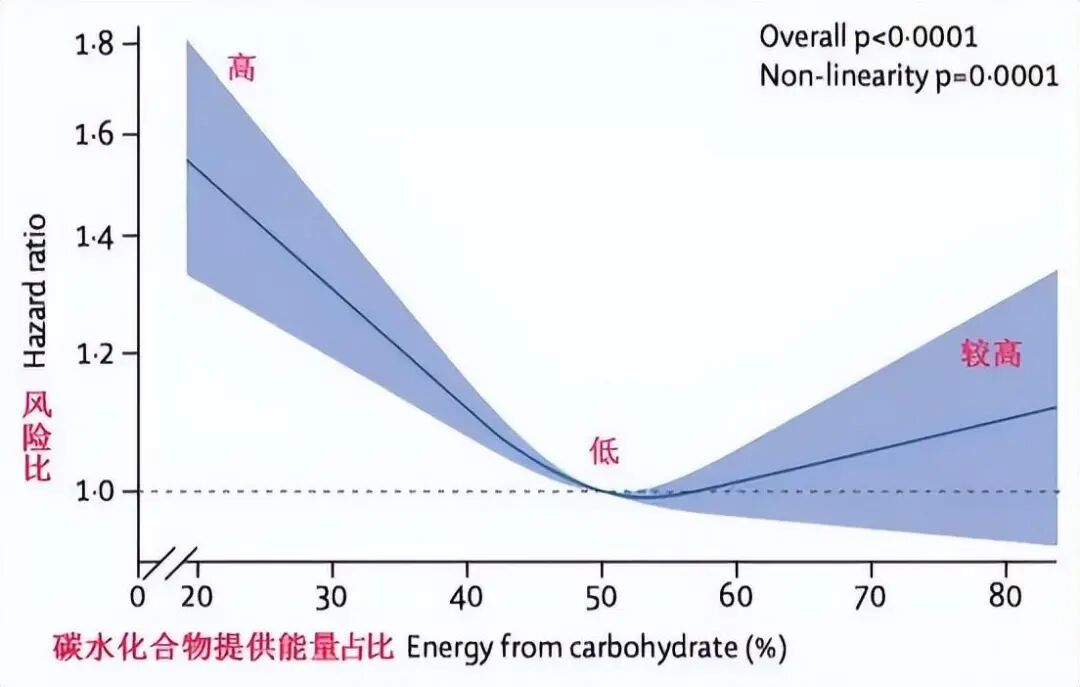 研究发现,主食摄入不足或过量都与增加死亡风险相关。一项涉及15428名志愿者的调查表明,主食摄入占能量比例在50~55%时,死亡风险最低;而当摄入量低于40%或高于70%时,死亡风险均显著增加,其中低摄入量的死亡风险更高。