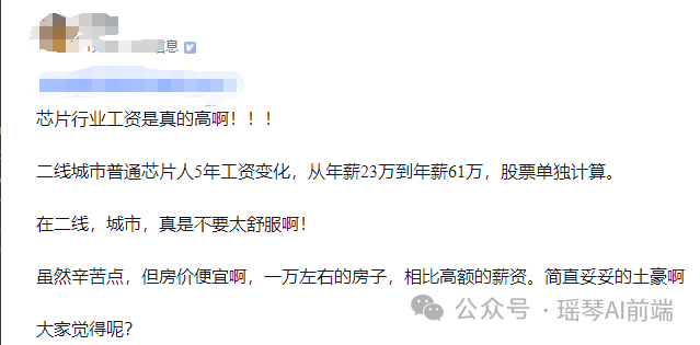 一网友自爆二线城市普通芯片人 5 年的工资从年薪 23 万涨到年薪 61 万,虽然辛苦点,但是房价便宜,这样的薪资在二线城市过的很舒服。