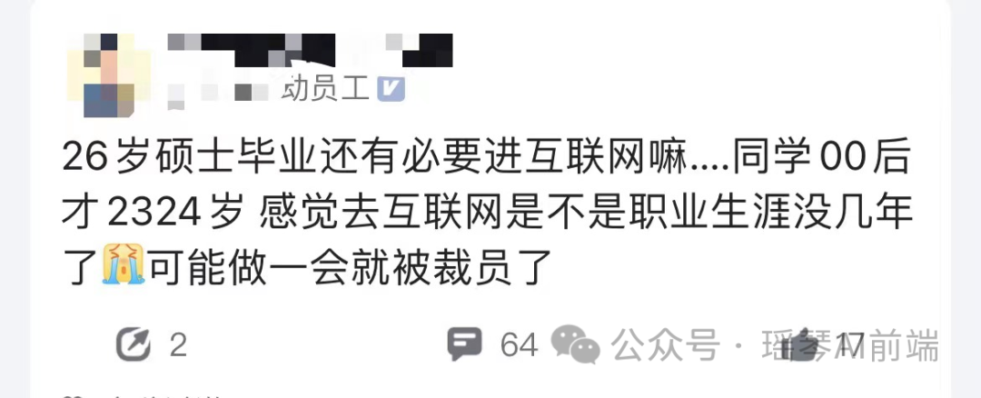 当然,互联网特别容易年龄焦虑是事实,行业正处寒冬,各大小厂都裁员。