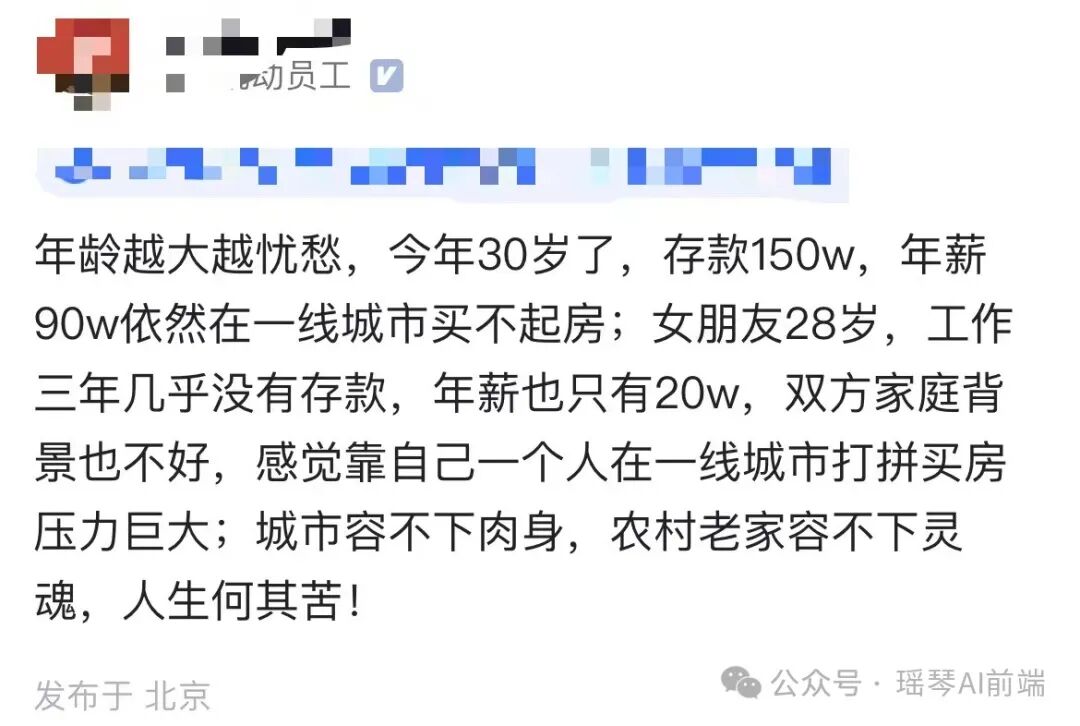 一网友发帖:”年龄越大越忧愁,今年30岁了,存款150w,年薪90w依然在一线城市买不起房;女朋友28岁,工作三年几乎没有存款,年薪也只有20w,双方家庭背景也不好,感觉靠自己一个人在一线城市打拼买房压力巨大。“