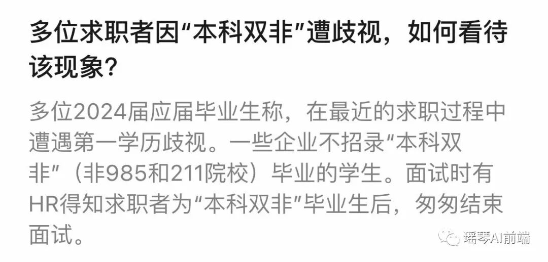 单看学历就匆匆结束面试,无疑是对求职者的不尊重,可能产生对求职者能力误判,如果企业明确不招双非本科的求职者,在招聘要求中就该写清楚,或在简历初筛阶段明确答复学历不符合要求,节约双方的时间和精力成本。