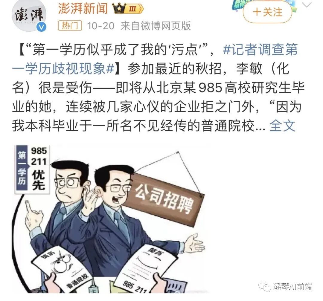 第一学历”歧视成为一种隐形存在,这个问题由来已久,但没有任何依据,这是企业招聘中的一种偏见,也反映社会偏见与不公,素质教育的目的也不应该是把人分为三六九等。