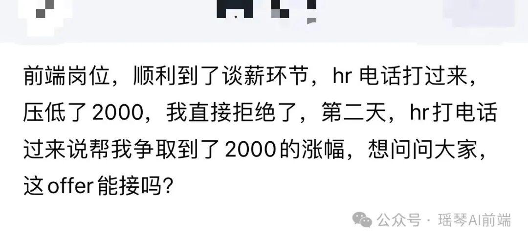 近日,有网友分享了一个面试,面试顺利到了谈薪环节,HR 故意压低 2000,我拒绝了,第二天HR又说帮我争取了 2000 的涨幅,不知道这个 offer 要不要接?