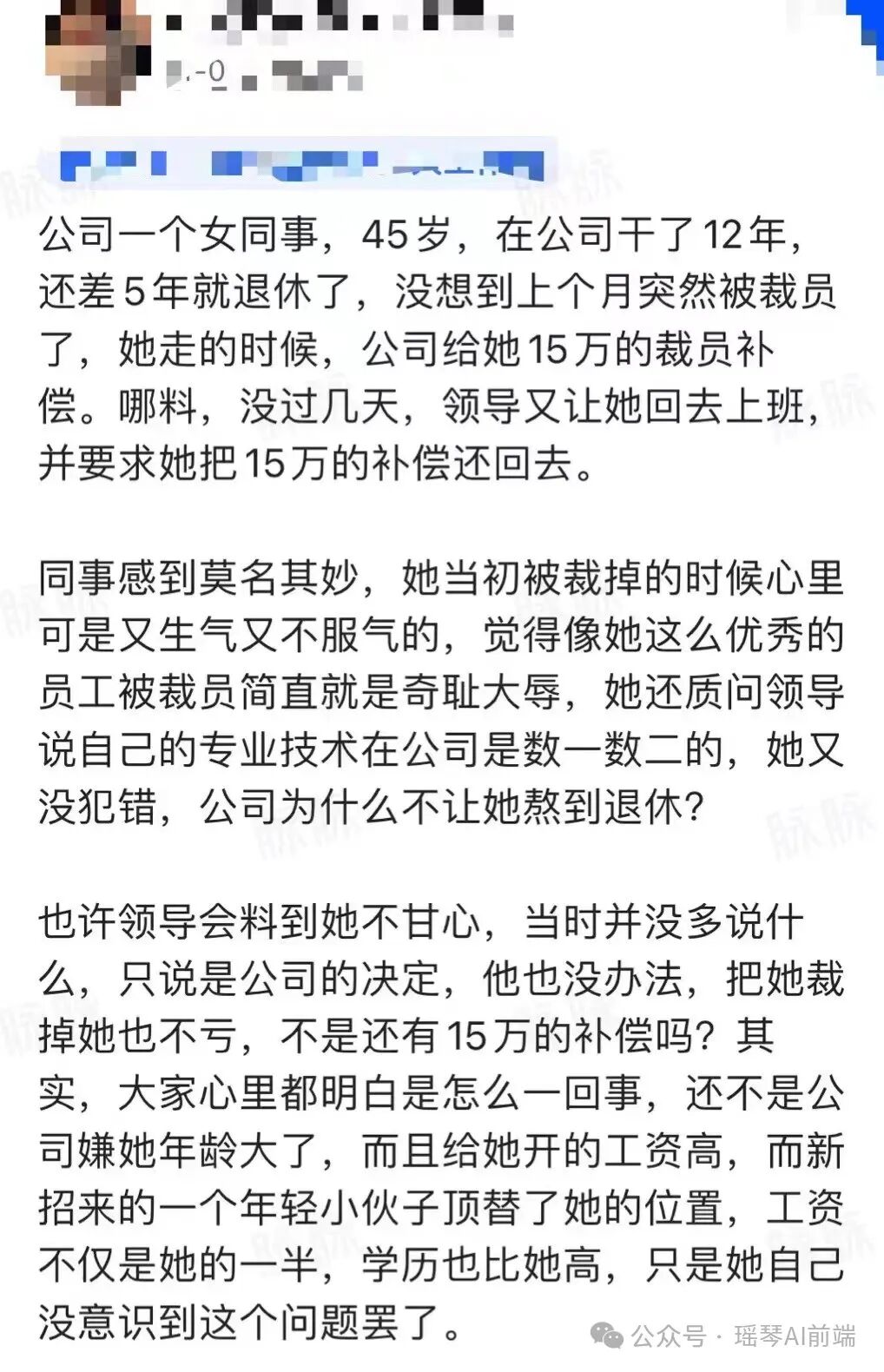 近日,就有网友在互联网上发帖,称公司一女同事在公司干了12年,差5年退休时,突然被裁员,公司给她补偿15万,女同事心里很不甘,但还是答应了公司。
