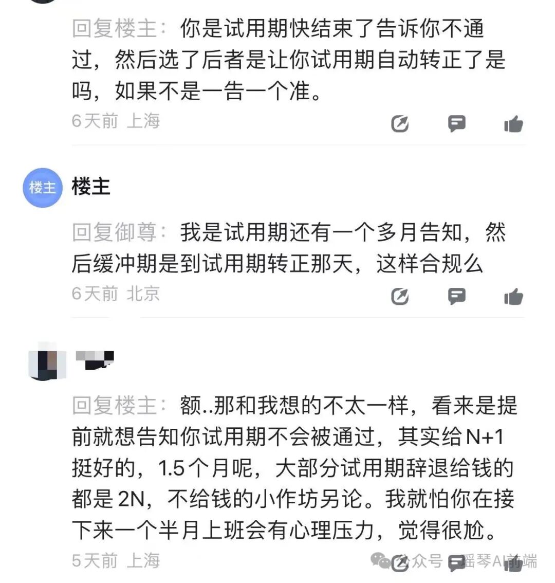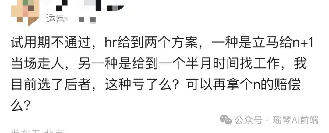 在职场中,打工人总是被动的,遵守公司的管理制度、考核标准,服从安排等等。昨天朋友跟我吐槽,现在的公司待了快一年,办了 2 张银行卡,每到一家新的公司,都要办新的银行卡,钱没多少,卡倒是堆了一抽屉。这让我想起前2天看到的一句话,“不掌握生产资料的人都属于劳动力”,挺有道理,普通人不掌握生产资料,拿人钱财,替人办事。近日,一网友在互联网上发帖,称自己试用期没通过,hr 给到两个方案,一种是立马给n+1当场走人,另一种是给到一个半月时间找工作,我目前选了后者,这种亏了么?可以再拿个n的赔偿么?