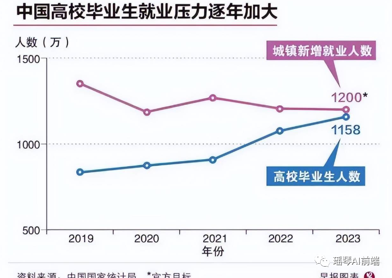 先来看看供给端,根据国家统计局发布的数据,2023年4月,我国16-24岁青年人失业率达到20.4%,这是2018年以来首次突破20%。2023 年大学生毕业人数 1158 万,达到了历史新高。而 2024 年的毕业人数是 1190 万,再创新高。