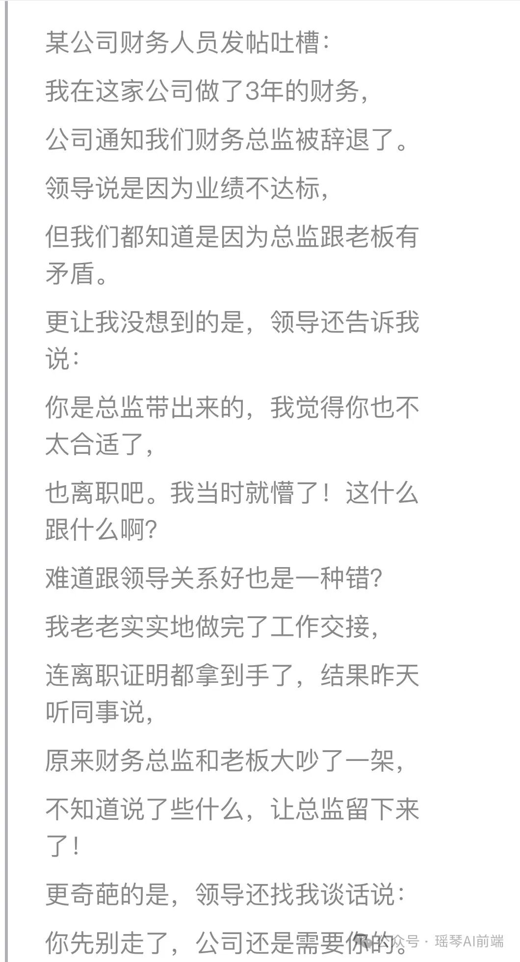 正如这位员工吐槽的那样,很多公司反复无常的领导很多,今天招人,过几个月指不定因为什么不相关的原因直接给你劝退了。