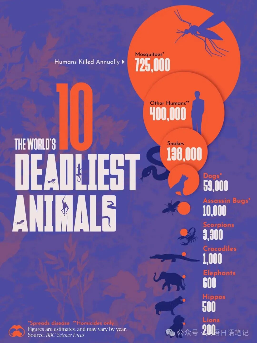 我们按照每年致人死亡数量进行排名,列出了十大最致命的动物。本图表和文章的数据来源于BBC Science Focus。