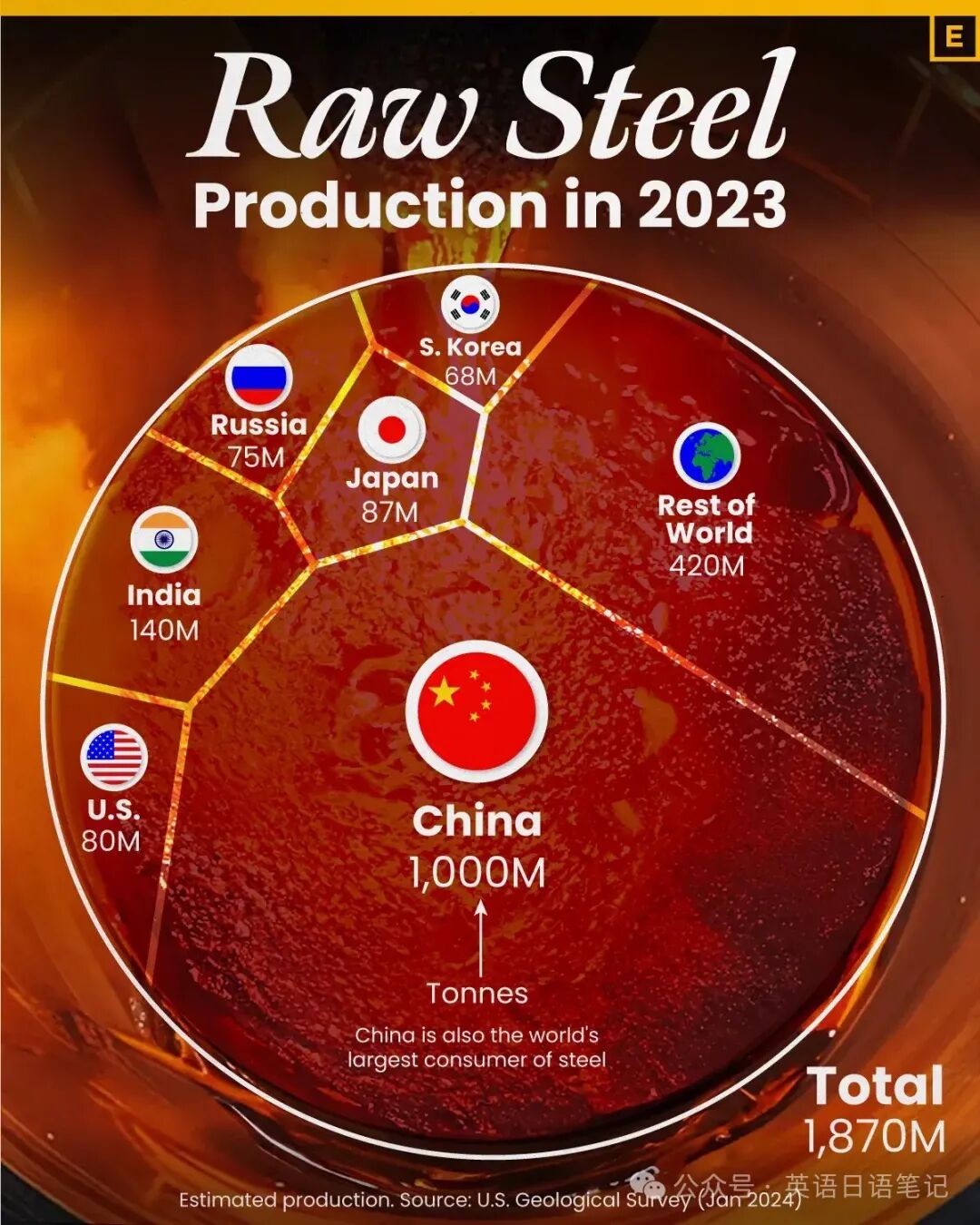 这张图表展示了2023年全球粗钢的估计产量。数据来自美国地质调查局2024年1月发布的资料。