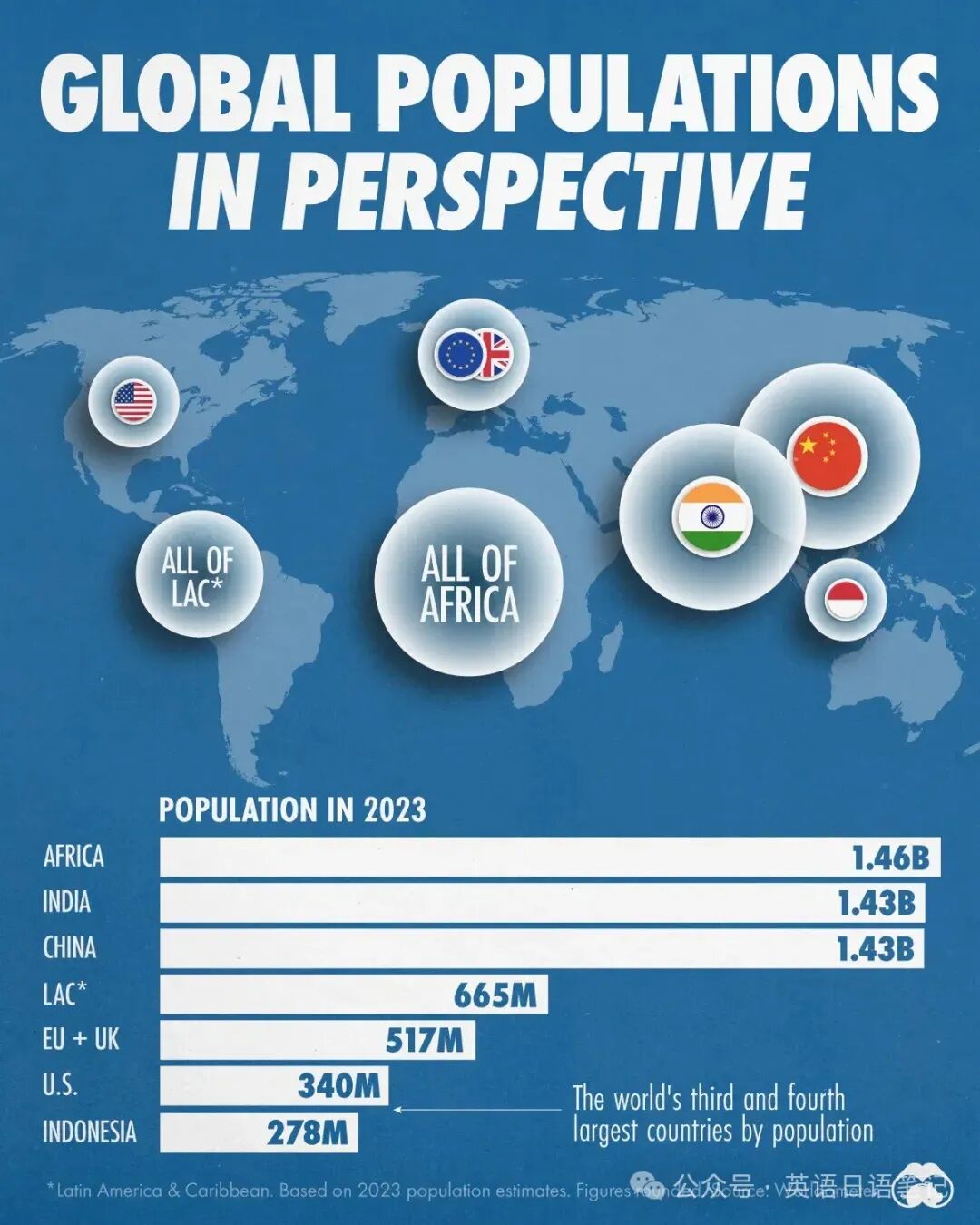 中国和印度的各自人口数量比拉丁美洲和加勒比地区人口数量的两倍还多,接近欧盟(包括英国)人口数量的三倍。