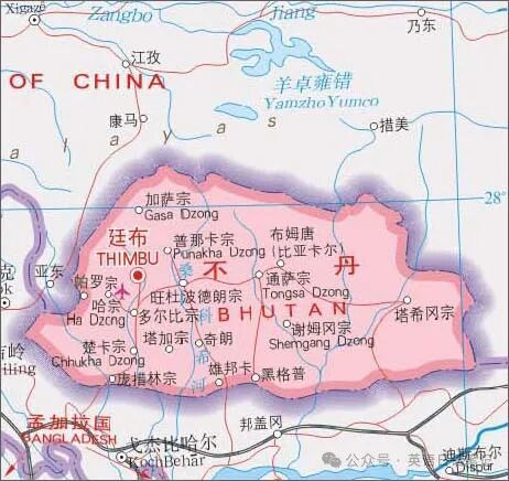 不丹王国位于喜马拉雅山脉东段的南麓,北边与中国接壤,南边与印度接壤。