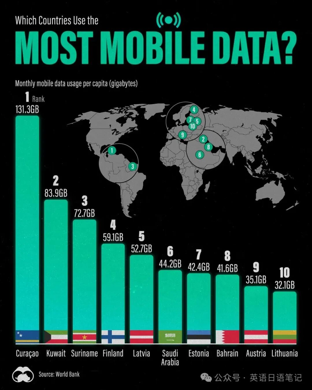 岛国库拉索以每月每人移动数据使用量131.3G排在第一名。