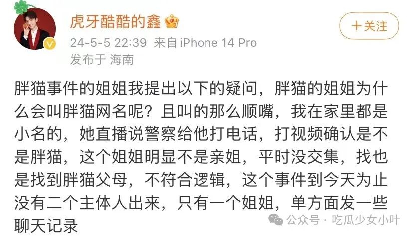 其次事件发生后,胖猫姐姐连夜就将自己社交平台的账号名称跟作品全部改了,而且这么多天下来,他姐姐从来称呼的都是胖猫这个网名,按理说如果真的是自己亲弟弟,总会在不经意间说出小名或者昵称吧,怎么可能都是胖猫胖猫的称呼。