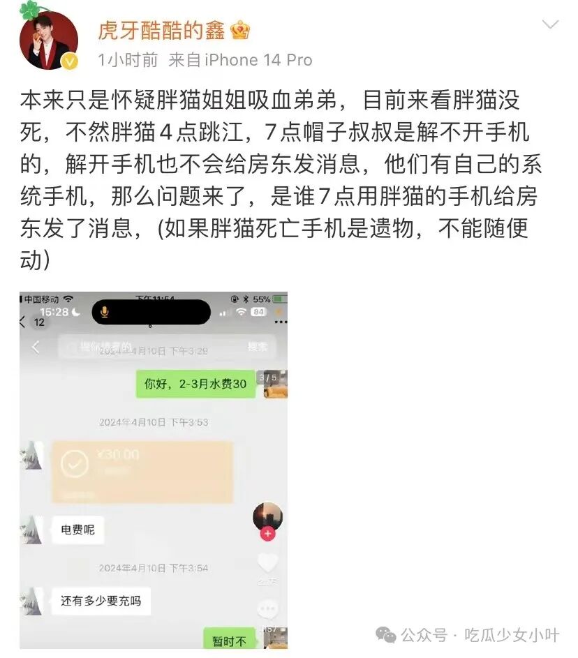 酷酷的鑫质疑的点也很简单,就是这次事件的当事人之一:胖猫的姐姐,他觉得当时胖猫在4月11号晚上跳江后,甚至还没过一会胖猫姐姐就接到了警方的通知,这明显不符合逻辑,哪怕是胖猫手机遗留下来,破解密码也需要耽误一段时间,怎么可能这么快就能通知到他姐姐呢?