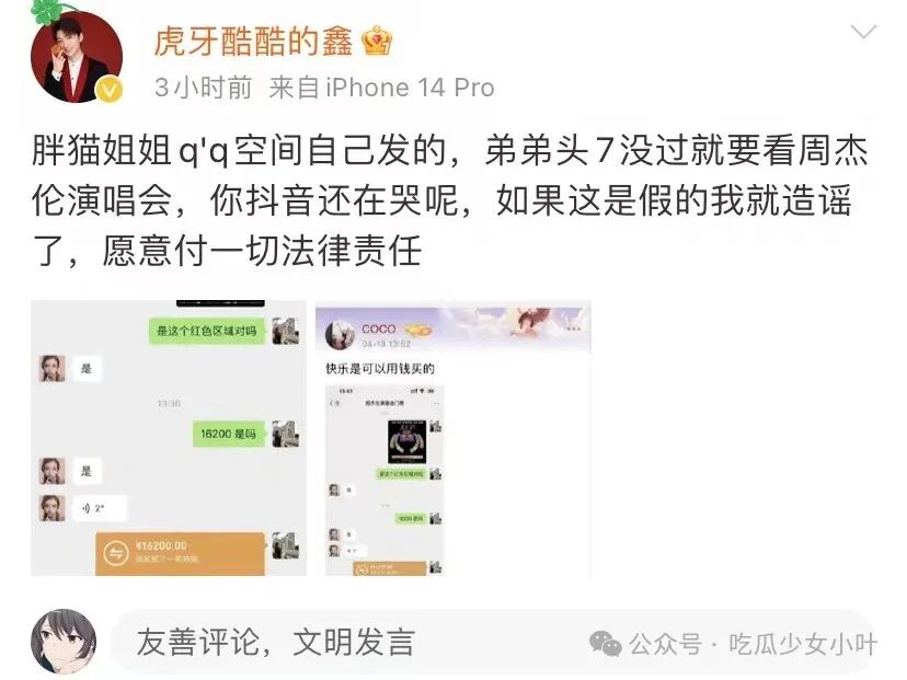 随后酷酷的鑫还曝料胖猫姐姐在弟弟轻生后不久还去看周杰伦的演唱会,如果是亲姐姐,不可能在如此悲痛的情况下还去做一些娱乐活动,这明显有点说不通,酷酷的鑫觉得胖猫姐姐可能不是亲姐姐,并表示如果上面所曝料的存在造谣自己愿意承当法律责任。