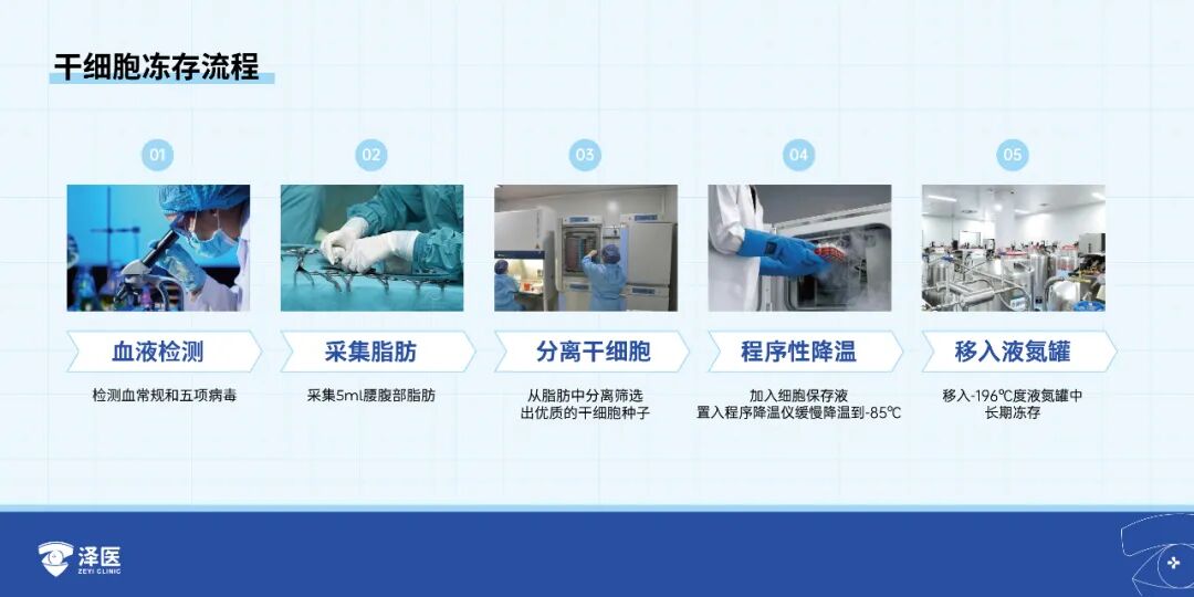 采集自体干细胞,在标准GMP实验室内分离、筛选出优质种子细胞,经体外培养、扩增后形成数亿量级的健康高活性细胞,再通过全自动化冷冻存储流程,将细胞放置于-196℃超低温液氮罐内冻存,需要使用时,可以随时提取。