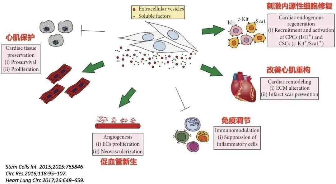 移植的干细胞可通过释放细胞因子、化学趋化因子、生长因子或微粒进入周围组织,促进再生过程,进而提高了心室功能、改善灌注、促进心肌修复。