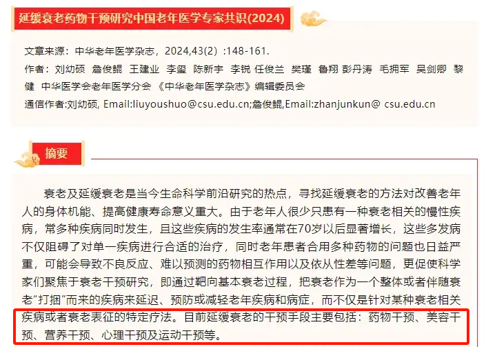 《中华老年医学杂志》也发布了《延缓衰老药物干预研究中国老年医学临床专家共识2024》,这是由中华医学会老年医学分会发起,我国老年医学专家中从事延缓衰老药物干预研究相关专家、学者共同完成的,其中干细胞治疗被认为是一种科学延缓衰老的干预手段。