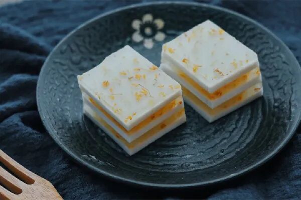 做法:取150克马蹄粉与100克糖桂花、300毫升清水混合均匀,制成桂花糖浆备用。将400克椰浆与150克马蹄粉搅拌均匀,放入模具中大火蒸制20分钟,然后倒入制备好的桂花糖浆,继续蒸制20分钟,取出后晾凉,撒上适量糖桂花或新鲜桂花花瓣即可食用。