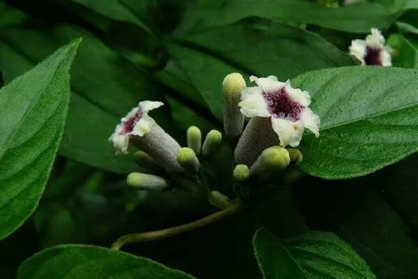3、鸡屎藤蔓生草本,基部木质,高2~3米,秃净或稍被微毛。叶对生,有柄;叶片近膜质,卵形、椭圆形、矩圆形至披针形,先端短尖或渐尖,基部浑圆或楔尖,两面均秃净或近秃净;叶间托叶三角形,长2~5毫米,脱落。圆锥花序腋生及顶生,扩展,分枝为蝎尾状的聚伞花序;花白紫色,无柄;萼狭钟状,长约3毫米;花冠钟状,花筒长7~10毫米,上端5裂,镊合状排列,内面红紫色,被粉状柔毛;雄蕊5,花丝极短,着生于花冠筒内;子房下位,2室,花柱丝状,2枚,基部愈合。浆果球形,直径5~7毫米,成熟时光亮,草黄色。花期秋季。