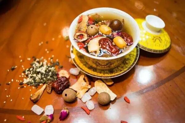 益气养血、滋阴益肾、疏肝解郁、固本培元。八宝茶又名三泡茶,以茶叶为底,其中掺有白糖或冰糖,玫瑰花,枸杞,红枣,核桃仁,桂圆肉,芝麻,葡萄干,苹果片等。喝起来其味香甜可口,别具滋味。八宝茶从其内含的成分来看,其营养丰富,茶中所含成分多为药食两用品,可以益气养血、滋阴益肾、疏肝解郁、固本培元。临床主要功用为:益气养血:常饮可以疗体虚体弱,四肢无力,头昏耳鸣。养阴益肾:常饮可以滋阴益肾,强身健体,治疗腰膝酸软,年老早衰。解郁安神:常饮八宝茶可以解郁安神,治疗焦虑症、抑郁症、失眠健忘等。