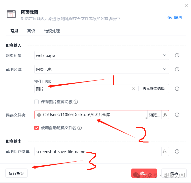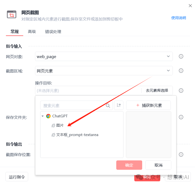第四步:选择指令:“网页截图”,选择元素,刚刚捕捉的图片元素。