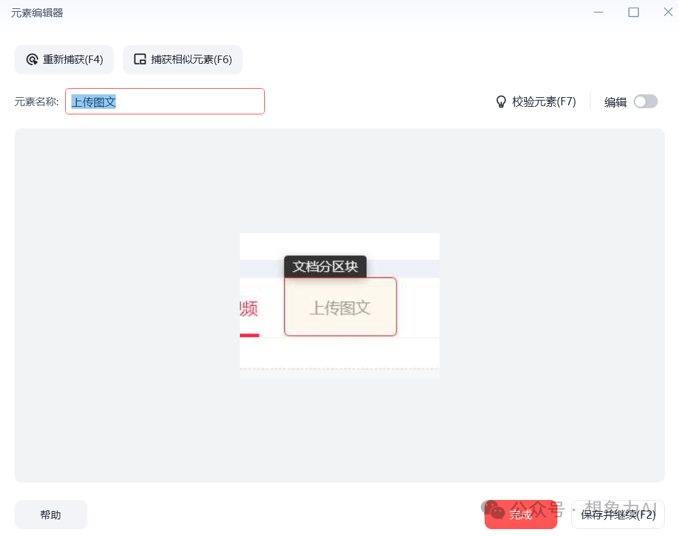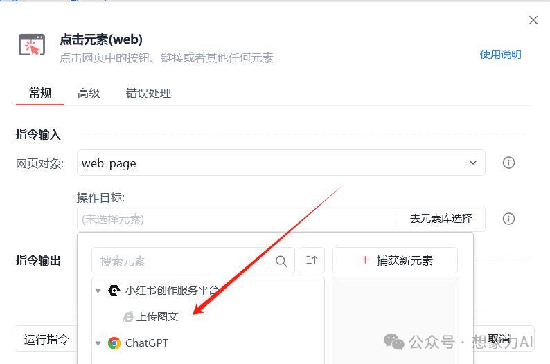 第三步:选择“点击元素”指令,选择刚刚捕捉的图文元素。可以点击运行指令一下。