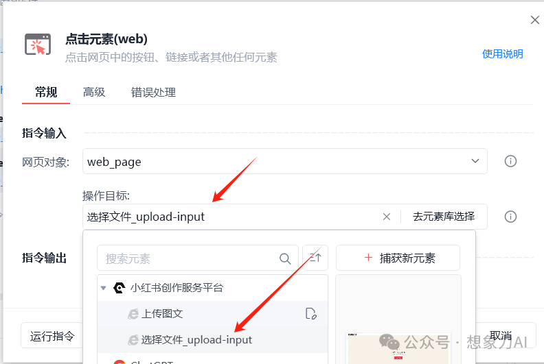 第二步:选择指令“点击元素(web)”,选中我们刚刚捕捉的元素。