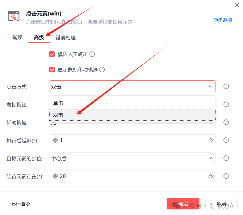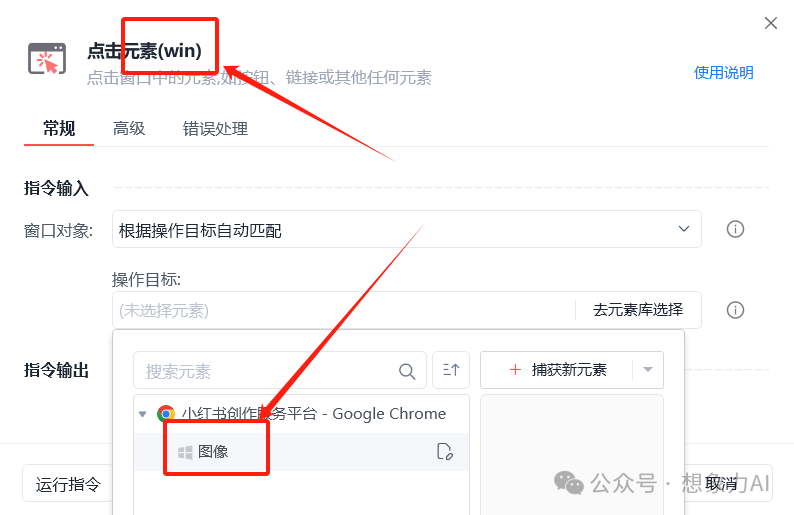 第五步,选择指令“点击元素(win)”,注意这里是win,前面都是web。选中图像这个元素。先别急着点完成,我们还要在中间的“高级”选项中,设置成鼠标左键双击。