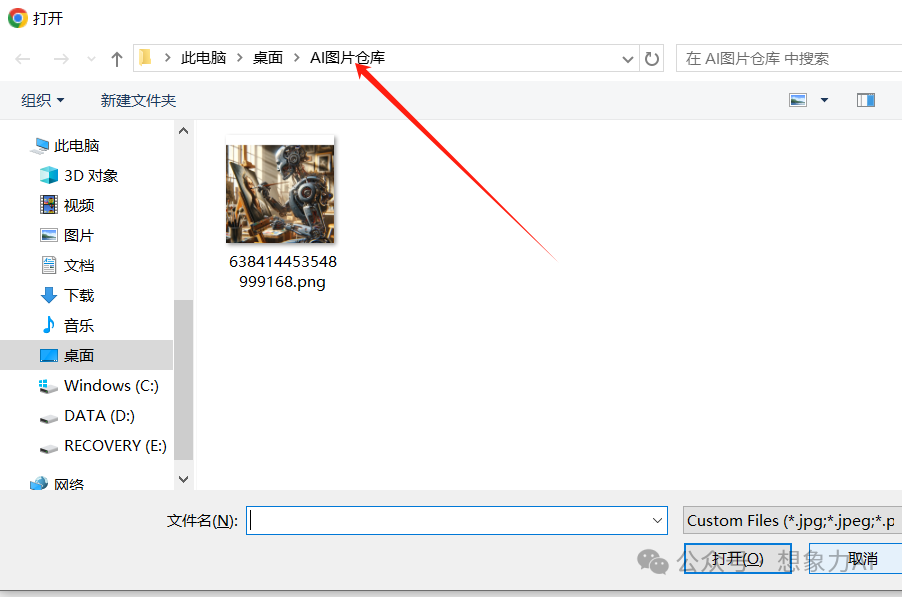 第三步:首先查看一下默认弹出的文件夹,是不是之前新建立的文件夹,如图所示。如果是,就继续下一步。如果不是,先选中自己的这个文件夹中的图片,上传一次图片,下次打开上传图片时,就是默认这个文件夹了。