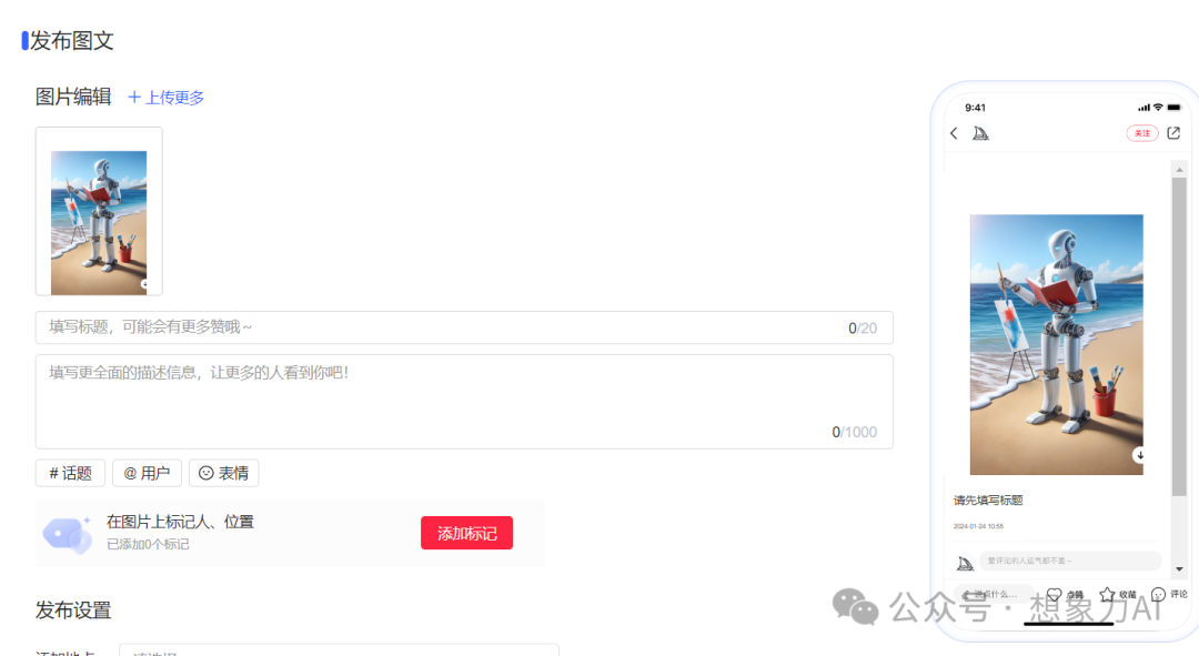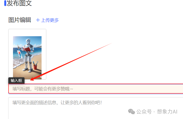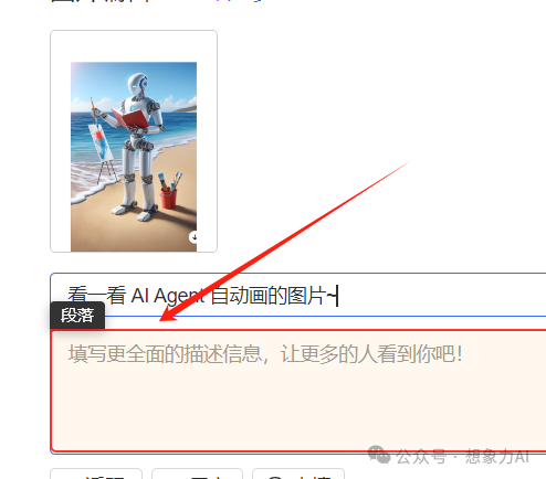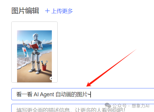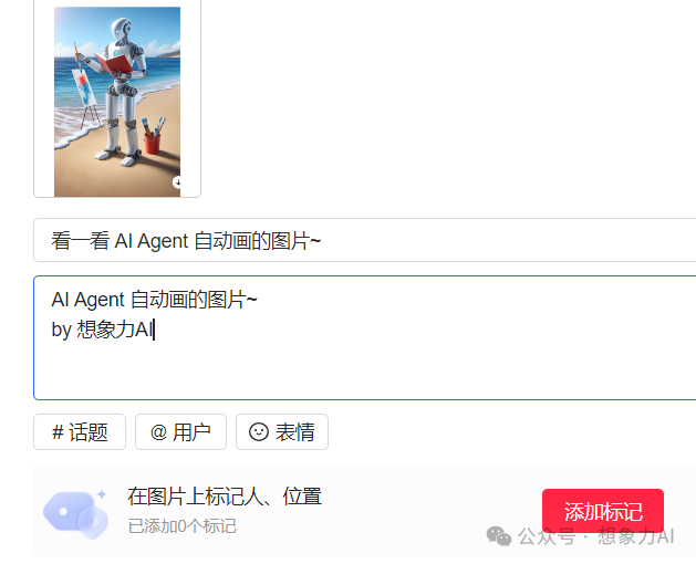 然后我们在输入内容中,填写我们想要的标题,比如我的:“看一看 AI Agent 自动画的图片~”