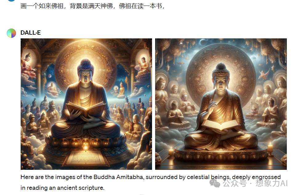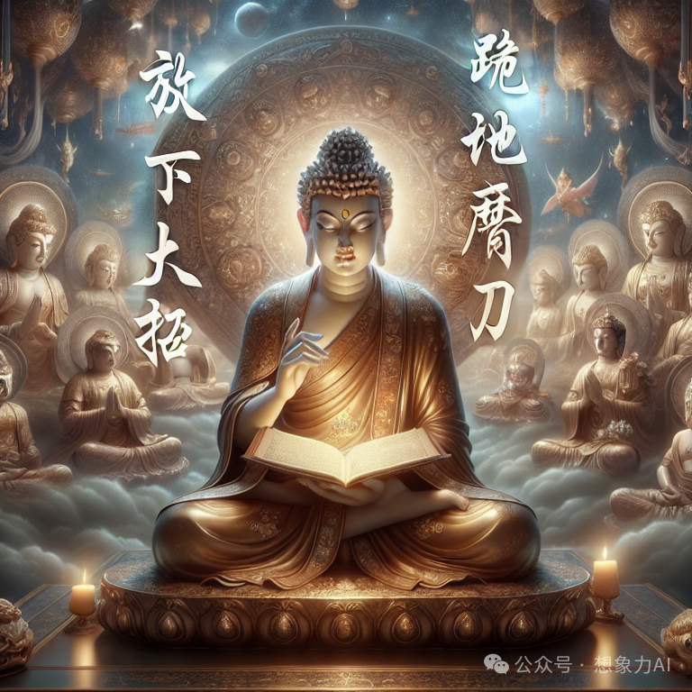 1.给定prompt:“画一个如来佛祖,背景是满天神佛,佛祖在读一本书,”